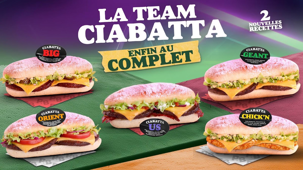 Pain ciabatta, steaks, oignons, cornichons, salade, cheddar fondu, sauce big